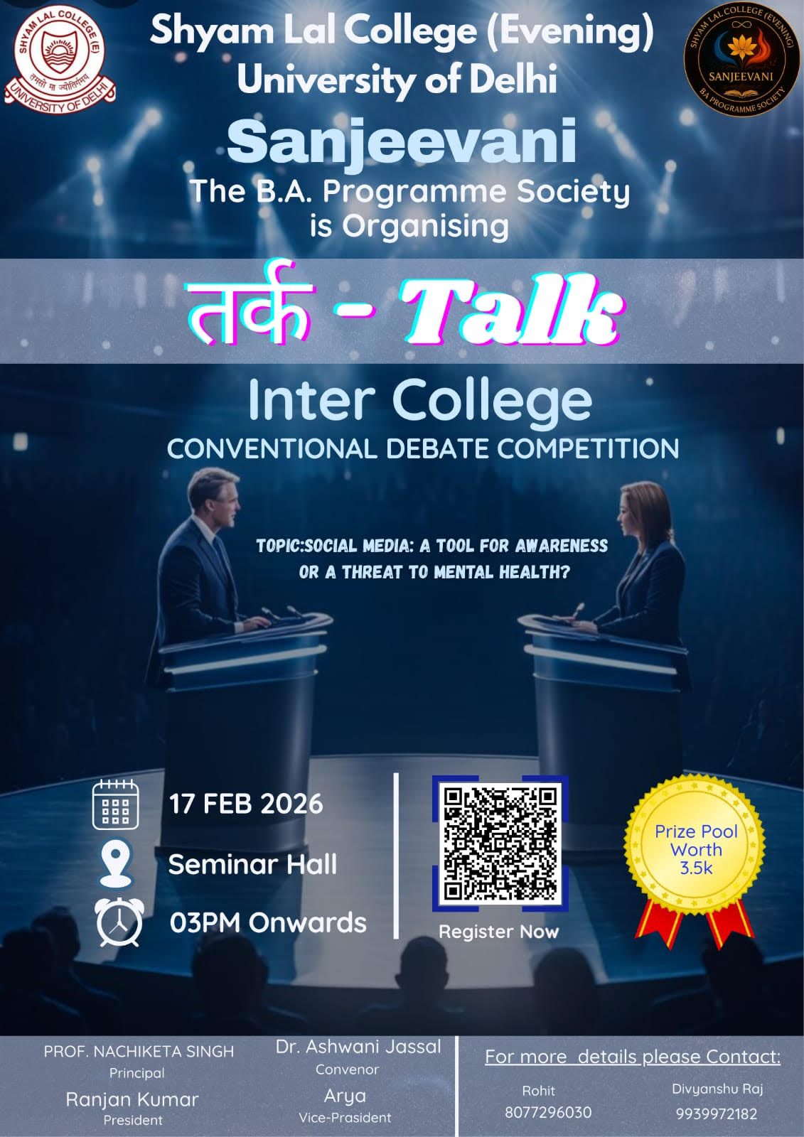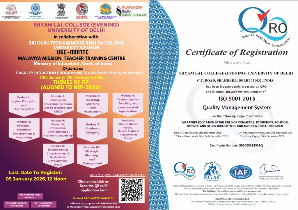Its an honour and pleasure on my part to assume the office of the Principal, Shyam Lal College (Evening) at a historic juncture of Diamond Jubilee since its foundation in 1964. It makes me feel immensely proud and honoured to have been entrusted with the responsibility of carrying forward the historic legacy of the institution and accomplish the cherished ideals and realise the vision of its founder Late Padma Shree Shyam Lal Gupta.